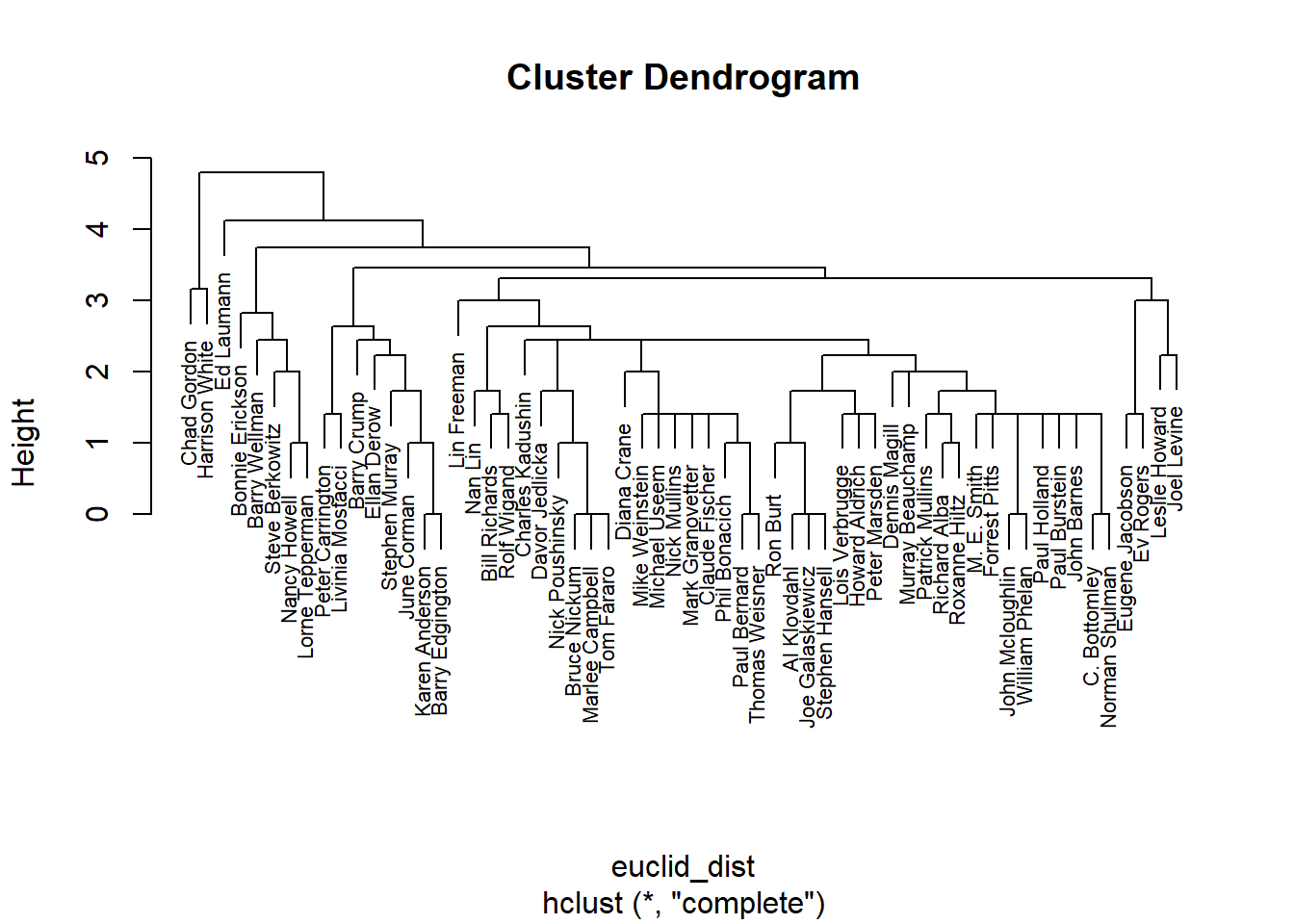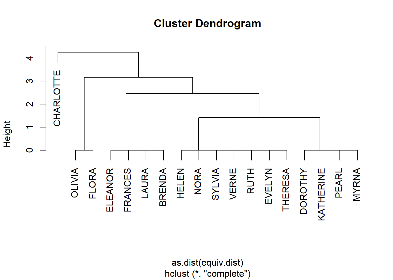 #> BUNNY 0 0 0 1 0To apply the CONCOR algorithm, we can simply run concor_hca() function and set the desired number of partitions (p). Note that this function works with lists of martices, meaning we need to put a single matrix inside the list(). The package author’s intention is clearly to run blockmodel when we have multiple ties in our network.