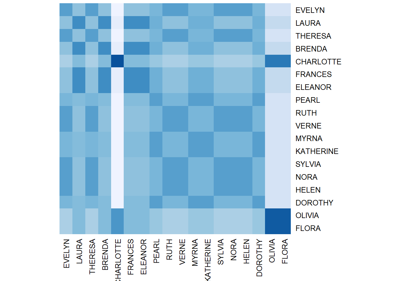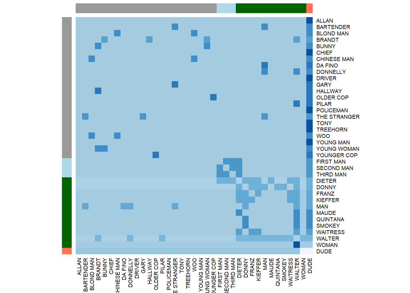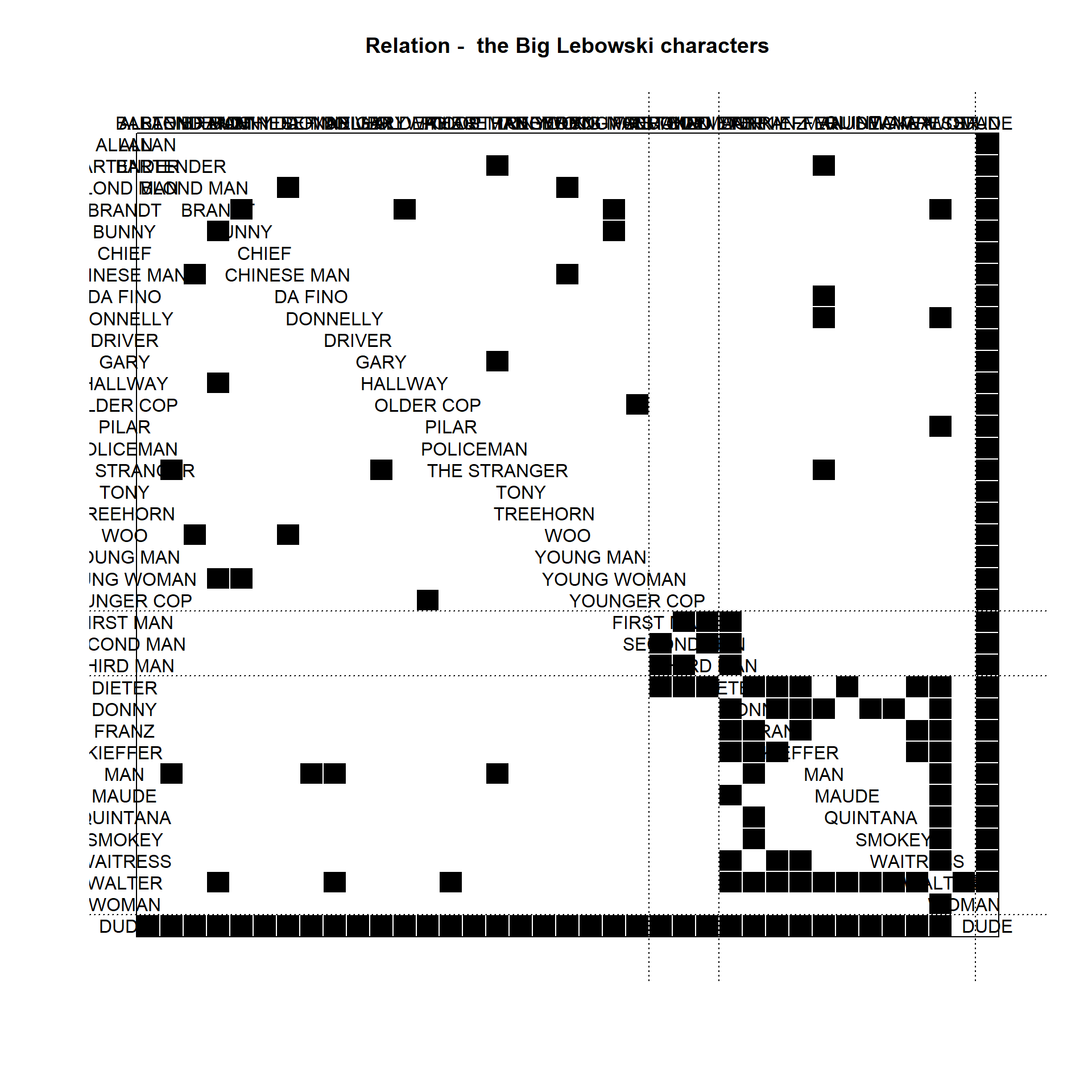 To run CONCOR, we first need to get a matrix representation of our network, or stack of matrices if we have data on multiple relations. To start with a simple example, let’s find the roles / blocks / positions in the Big Lebowski(1998) characters’ network. First, we need to get an adjacency matrix: