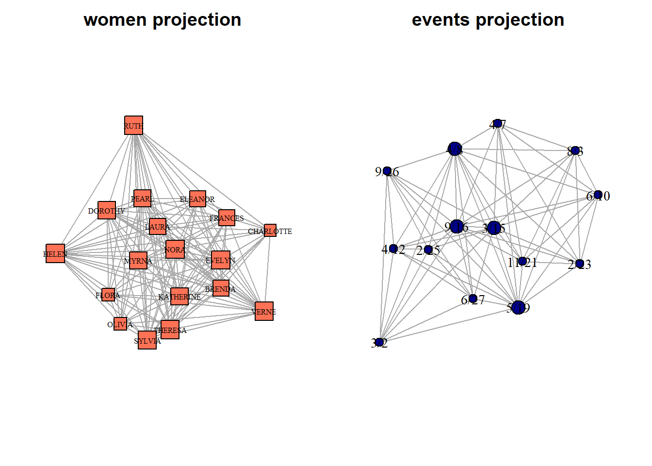 The data for the first part of today’s session comes from the famous study conducted by Davis and his colleagues (1941). It represents attendance data from 14 social events hosted by 18 women in the American South during the 1930s. This bipartite network captures the affiliations between women and events, highlighting patterns of social interaction, group formation, and shared affiliations. It is a classical dataset to tell students about the two-mode network analysis.